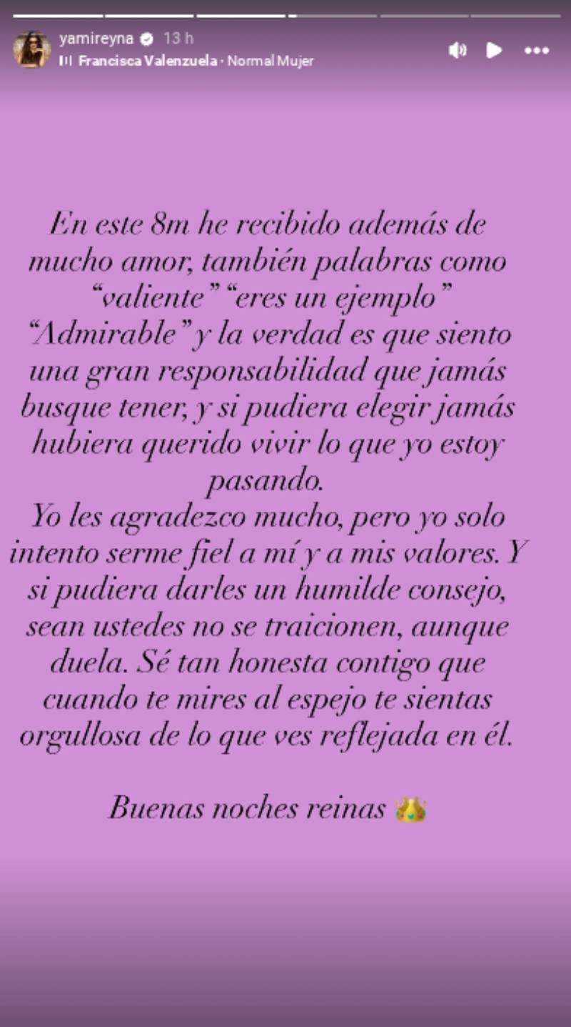 "En este 8 de marzo he recibido, además de mucho amor, también palabras como 'valiente', 'eres un ejemplo', 'admirable', y la verdad es que siento una gran responsabilidad que jamás busqué tener", dijo inicialmente.