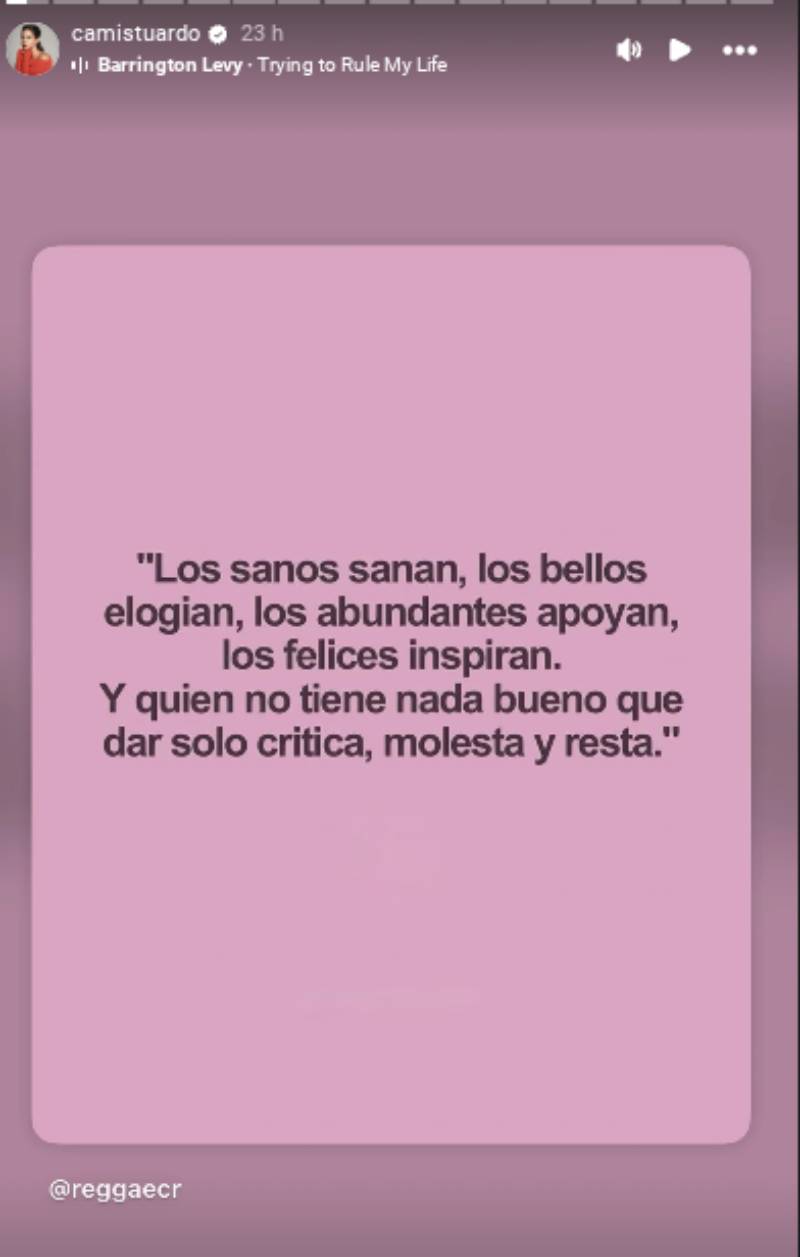 Stuardo no detalló qué la inspiró a reflexionar sobre el tema, pero poco después compartió un mensaje en la misma tónica. "Los sanos, sanan; los bellos, elogian; los abundantes, apoyan; los felices, inspiran; y el que no tiene nada bueno que dar, solo critica y resta", se lee en su historia.