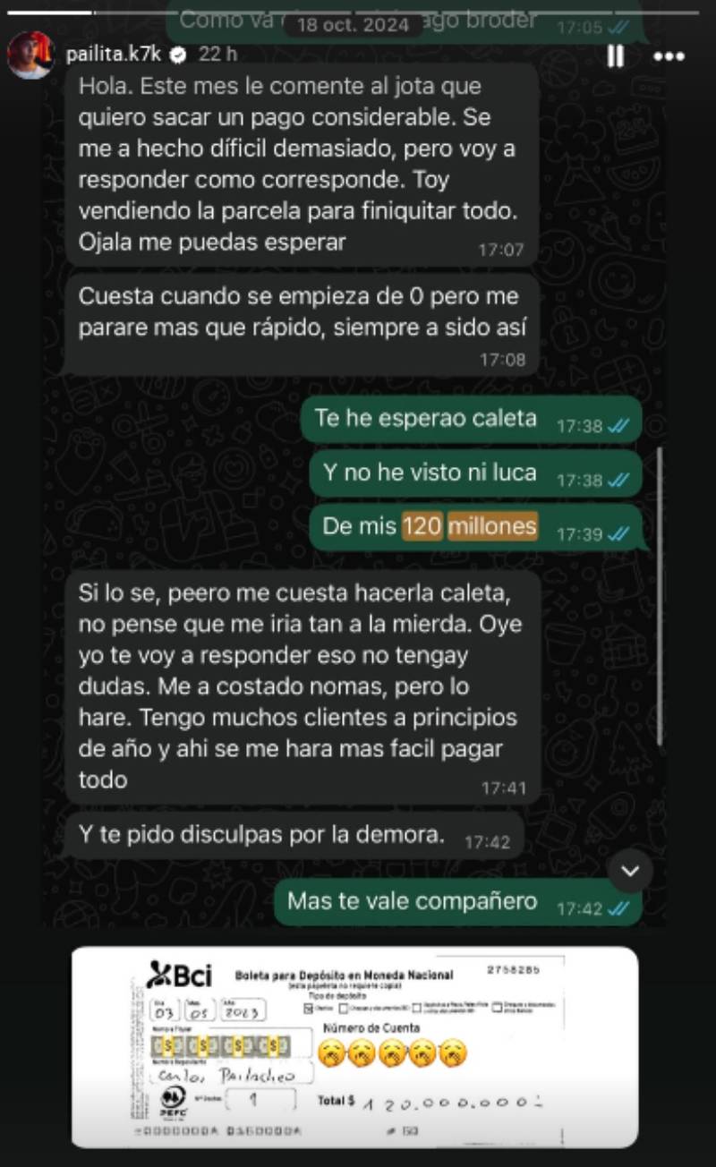 En sus registros, Pailita mostró la captura de un chat, del 18 de octubre de 2024, en el que recalca: “Te he esperado caleta y no he visto ni luca de mis 120 millones”.