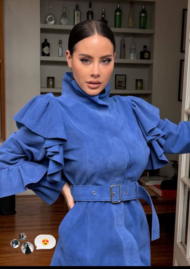 Para Braun, Michelson recorrió la pasarela con un vestido azul de textura aterciopelada y mangas estructuradas con holanes. La prenda tenía cuello de tortuga y enmarcó su figura con un cinturón a juego y una falda corta.