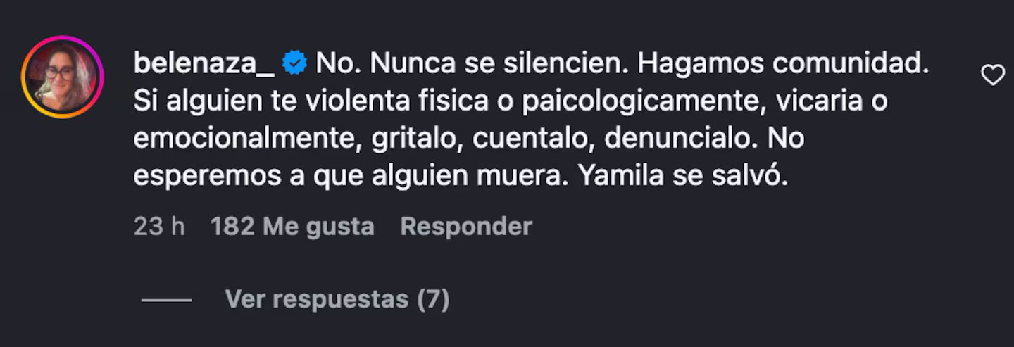 Frente a estas palabras, Belén Mora, amiga de Yamila, reaccionó de inmediato a través de los comentarios en la cuenta de Instagram del programa, defendiendo a la actriz y enviando un mensaje contundente sobre la importancia de no silenciar la violencia: