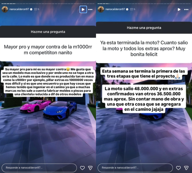 A su vez, el hermano menor de Kel Calderón también reveló cuánto ha gastado en su nuevo medio de transporte: “La moto salió $48.000.000, y en extras confirmados van otros $36.500.000 más, aproximadamente”.