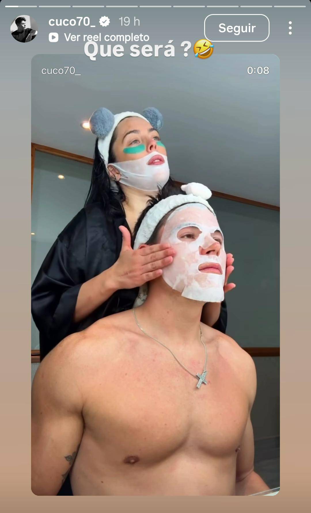 En el video, Cuco luce "resignado", mientras está con el torso desnudo y tiene una mascarilla hidratante en su rostro. A sus espaldas, Daniela luce un cintillo sobre su cabello y parches faciales, mientras le acomoda la mascarilla a su pololo.
