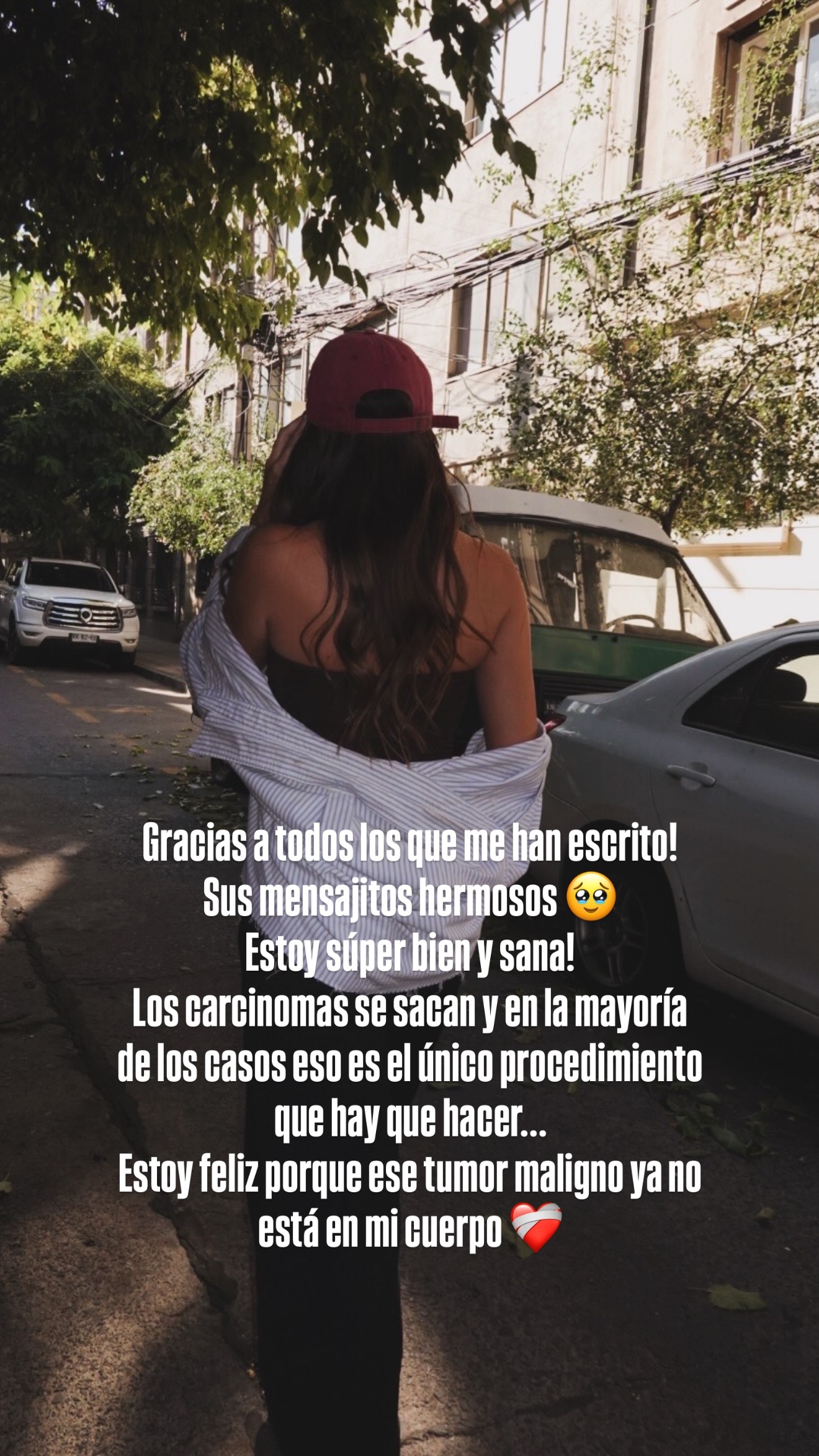 Finalmente, la influencer agradeció el apoyo que recibió de sus seguidores e hizo una emotiva reflexión: "Gracias a todos los que me han escrito, sus mensajitos hermosos, estoy súper bien y sana. Los carcinomas se sacan y en la mayoría de los casos eso es el único procedimiento que hay que hacer. Estoy feliz porque ese tumor maligno ya no está en mi cuerpo".