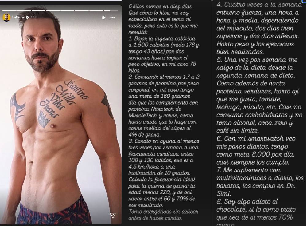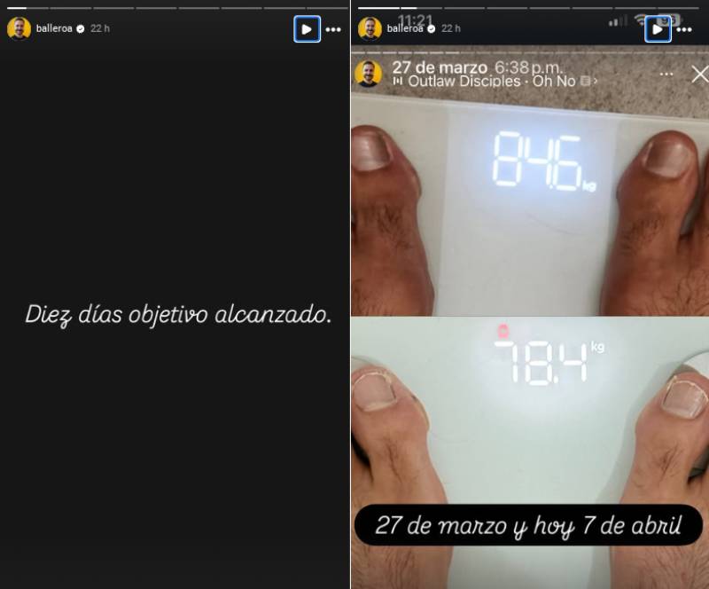 "Objetivo alcanzado", dijo Álvaro Ballero en una historia de Instagram, antes de publicar una imagen que evidencia el resultado al subir a la balanza el 27 de marzo y luego el 7 de abril. En apenas 10 días, pasó de pesar 84.6 kilos a 78.4.