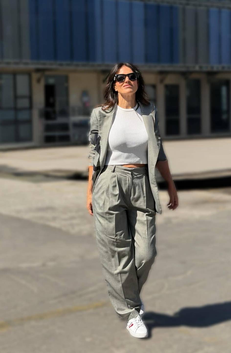 En las postales, Yamila lució empoderada con un traje sastre en tono gris y de corte holgado, compuesto por pantalones de tiro alto y un blazer arremangado. Este set lo combinó de forma casual con un croptop blanco.