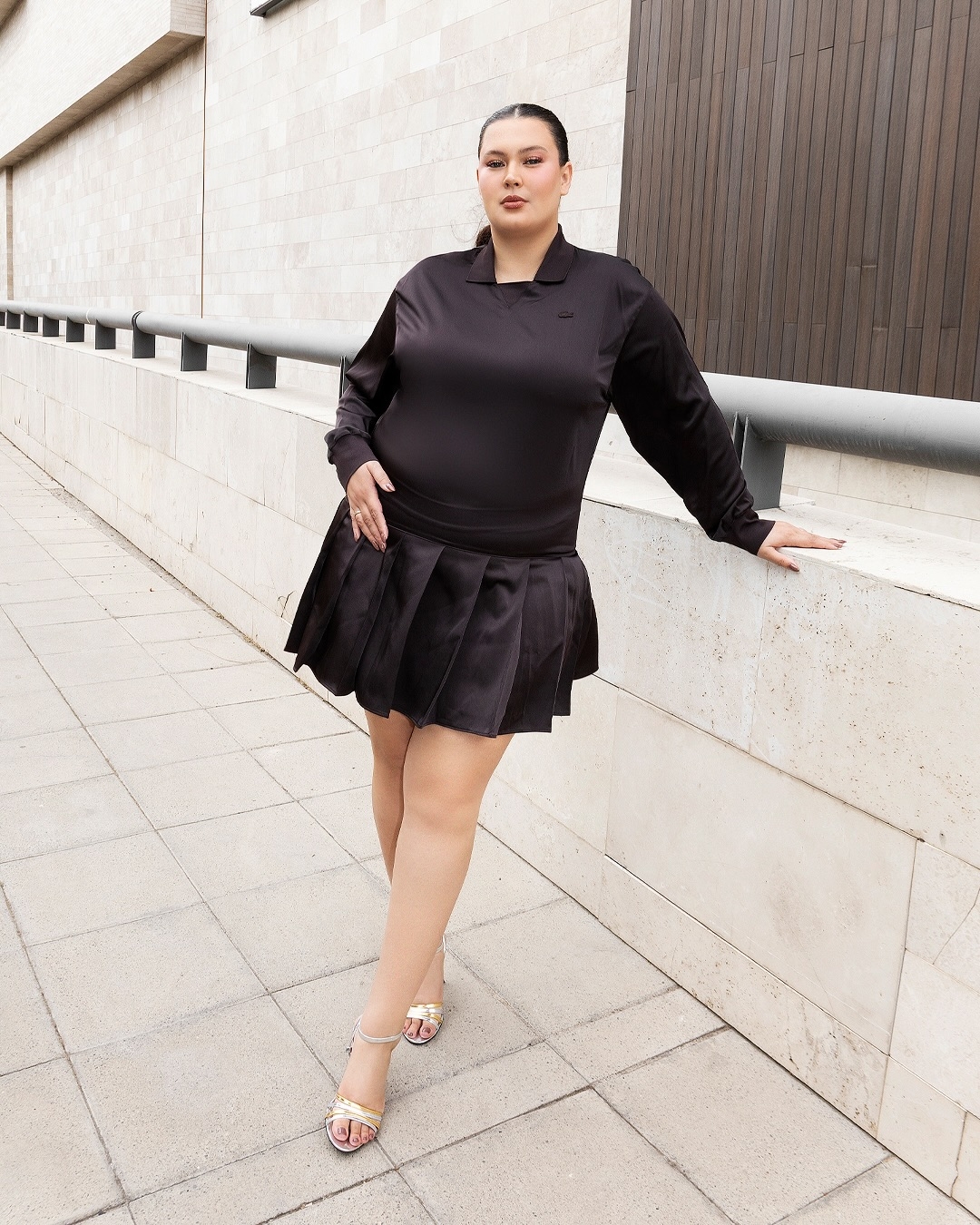 En las imágenes, la chica reality luce un sofisticado outfit monocromático negro de Lacoste, integrado por una blusa satinada de mangas largas y una minifalda de tablones.