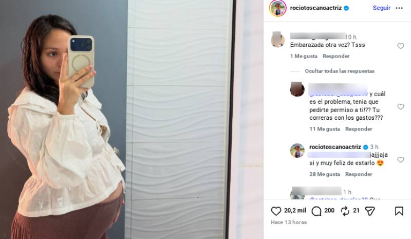 "¿Embarazada otra vez?", escribió el usuario, a quien Toscano respondió entre risas: "Sí, y muy feliz de estarlo".