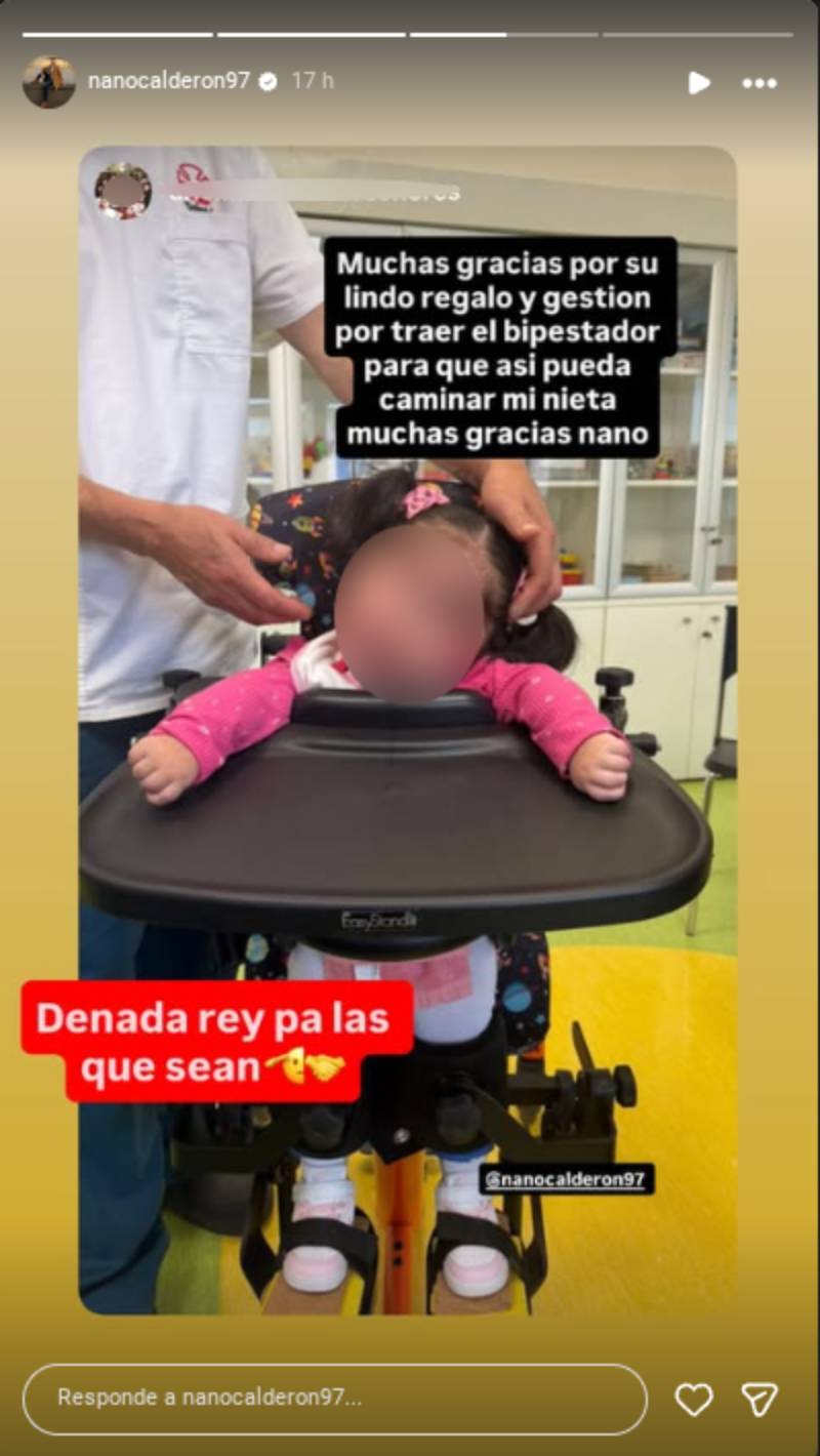 Nano Calderón publicó en Instagram una historia que posteó originalmente uno de sus seguidores, un mensaje de agradecimiento para el empresario. En la imagen se ve a una pequeña niña con un equipamiento médico que le permite estar de pie.