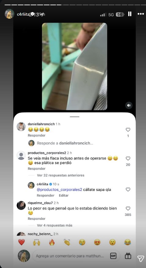 Fue así que un usuario de Instagram realizó un feo comentario sobre el aspecto físico de Carlita, el cual la joven decidió exponer en su perfil.