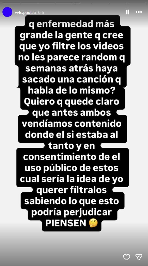 "Qué enfermedad más grande la gente que cree que yo filtro los videos", indicó en sus historias, para luego comentar que los videos eran de la época en que "ambos vendíamos contenido. Estos fueron de uso público durante un periodo largo -que después- ambos decidimos eliminar".