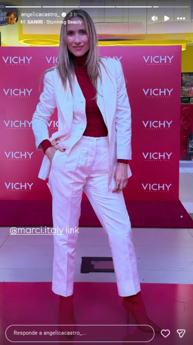 En las imágenes que compartió en su cuenta de Instagram, Angélica Castro lució un traje blanco de tres piezas: un chaleco abierto, un blazer de líneas limpias y un pantalón sastre con pinzas que definieron su figura.