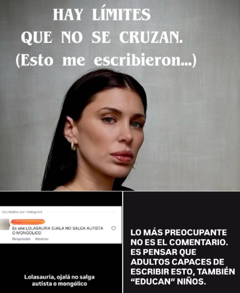 "Hay límites que no se cruzan. Esto me escribieron", se lee sobre el video, junto a la captura del fuerte comentario de un internauta: "Es una Lolasauria. Ojalá no salga autista o mongólico".