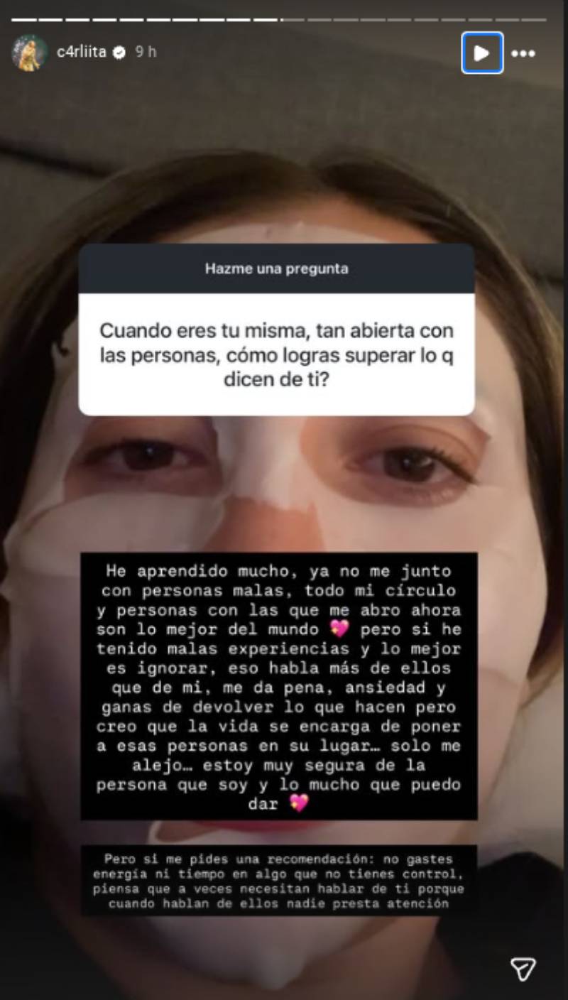 "Cuando eres tú misma, tan abierta con las personas, ¿cómo logras superar lo que dicen de ti?", fue uno de los planteamientos que recibió Carlita Inostroza en una interacción con sus fans en Instagram.