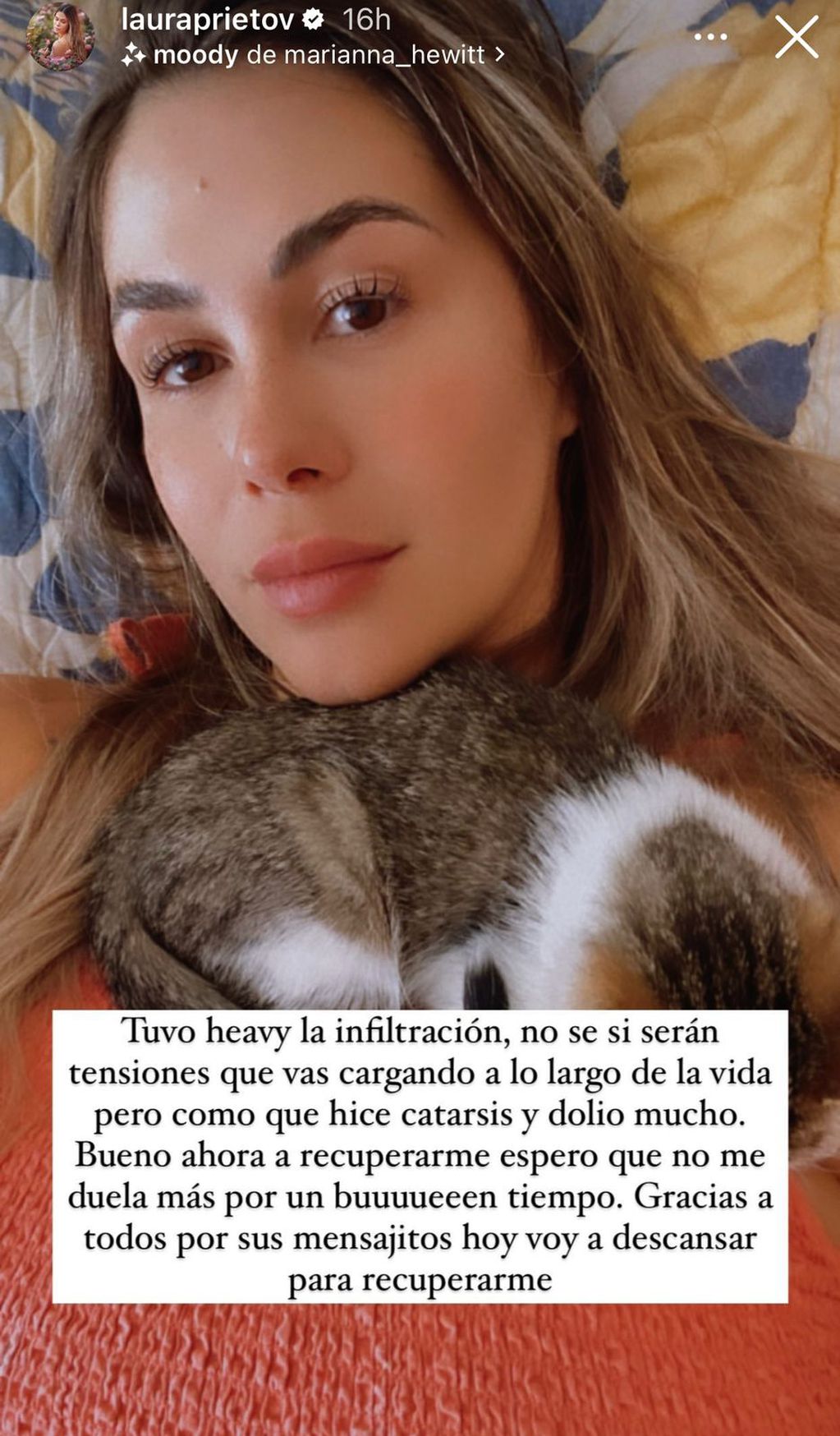 Tras haberse sometido a la infiltración, Laura subió otra historia donde contó sobre el resultado del procedimiento, "tuvo heavy la infiltración, no sé si serán tensiones que vas cargando a lo largo de la vida pero como que hice catarsis y dolió mucho".