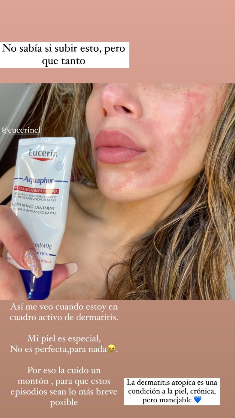 Si bien, esta no es una enfermedad grave a nivel de salud, es algo que la afecta mucho emocionalmente. Por lo mismo, y al igual como lo hizo hace unos meses, la exchica reality compartió a través de sus historias una fotografía de su rostro, en el que se logran ver los efectos de esta enfermedad.