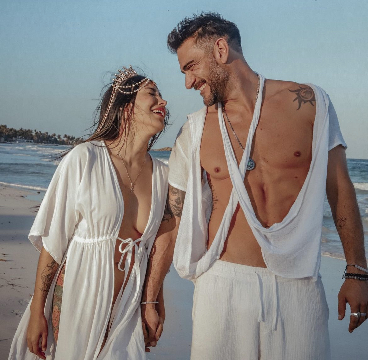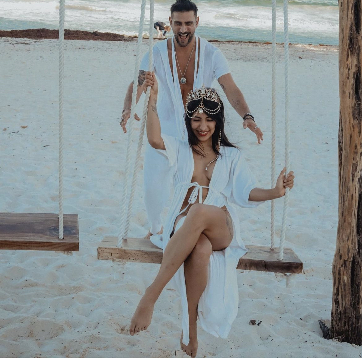 El exchico reality se ve junto a a su pareja en una playa de Tulum, donde ambos están semi-desnudos con telas blancas, disfrutando en columpios.