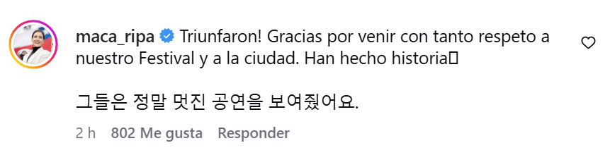 Y como gesto del intercambio cultural con Corea del Sur, agregó en hangul (alfabeto coreano): "Ofrecieron un espectáculo realmente fantástico".