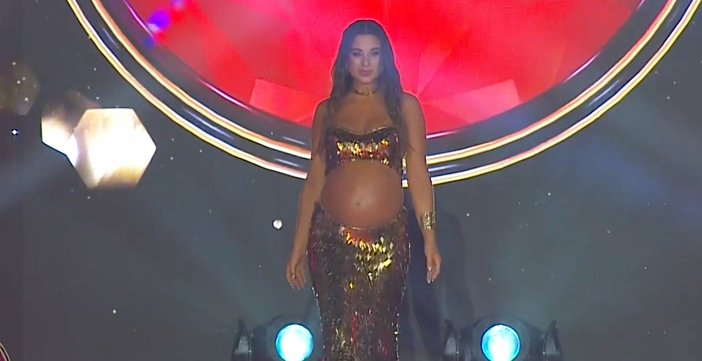 El look incorporaba un corte en la zona del vientre, detalle que permitió lucir con orgullo su embarazo, llenándose de elogios en la transmisión.