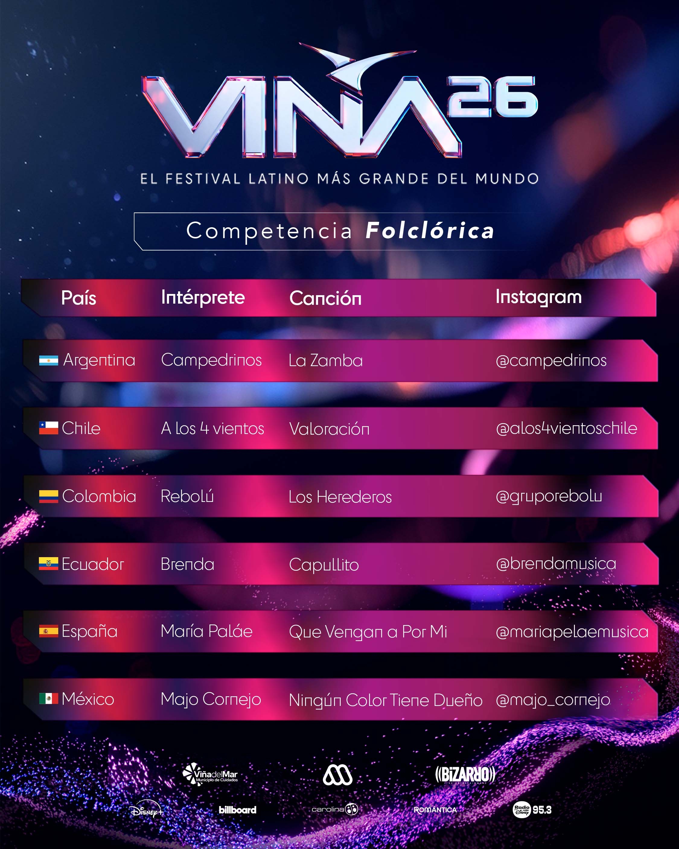 Por su parte en la competencia folclórica, en esta oportunidad se hizo un acercamiento más profundo a la música de raíz y el resultado fue las siguientes canciones e intérpretes: Chile, con el grupo A los 4 vientos y la canción “Valoración”; Argentina, Campedrinos “La Zamba”; México, Majo Cornejo “Ningún color tiene dueño”; España, María Peláe “Que vengan por mi”; Colombia, Rebolú / “Los Herederos” y Ecuador con la cantante Brenda que interpretará “Capullito”.