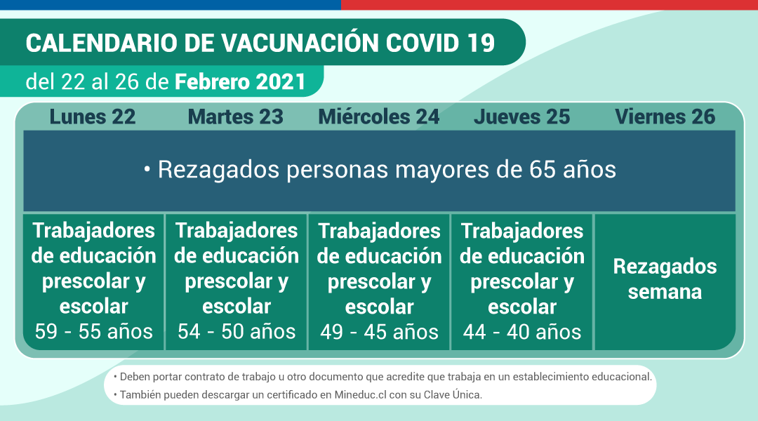 Así, desde el 22 al 26 de febrero se continuará inmunizando a todos los adultos mayores sobre 65 años que hayan quedado rezagados de sus respectivas fechas, además de los trabajadores de la educación prescolar y escolar que presenten un documento de acreditación. En cuanto a los grupos específicos que serán inoculados por día, el listado es el siguiente: