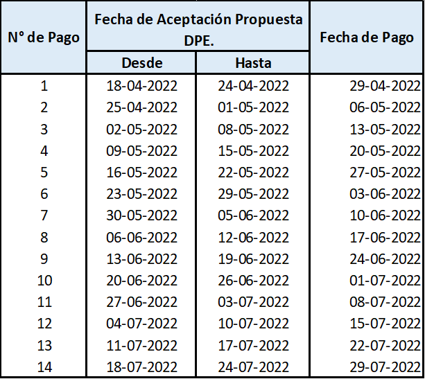El pago podrá ser recibido por las personas cotizantes o empleadores en un plazo que varía entre 5 a 10 días hábiles, según la fecha en que haya aceptado la propuesta y de acuerdo con el siguiente calendario de pago: