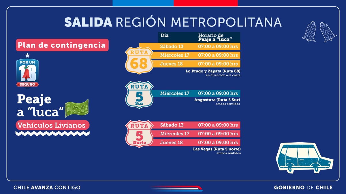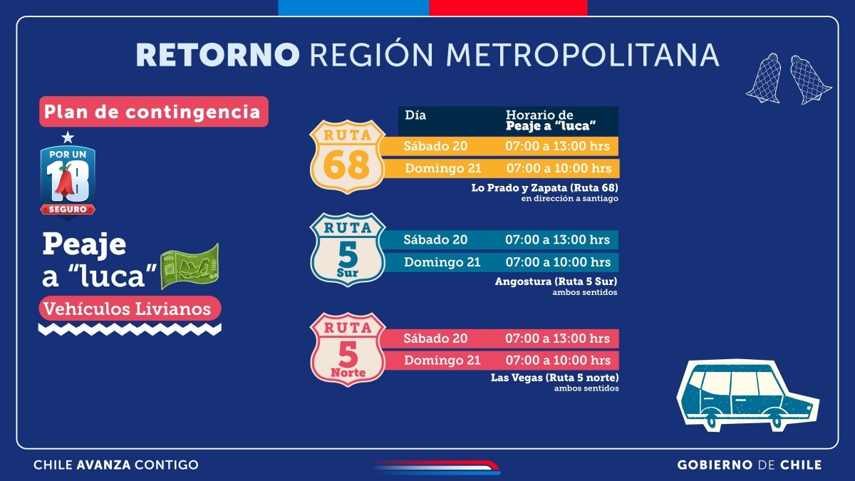 Mientras que para el regreso, habrá "Peaje a Luca" en las mencionadas carreteras, el día sábado 20 de 7:00 a 13:00 y el domingo 21 de 7:00 a 10:00, bajo el siguiente detalle: Ruta 68 hacia Santiago; Ruta 5 Norte y Ruta 5 Sur en ambos sentidos.