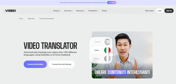 Con Veed.io puedes generar subtítulos para tus videos en 125+ idiomas distintos utilizando una tecnología GPT avanzada. Además, esta start-up de inteligencia artificial también ofrece servicios de doblaje en múltiples idiomas. Estos doblajes adaptarán el sonido de tus videos al idioma objetivo empleando una voz artificial. Su plan anual Pro cuesta 288 $ más impuestos. El plan Lite es más económico, pero no incluye servicios de traducción.