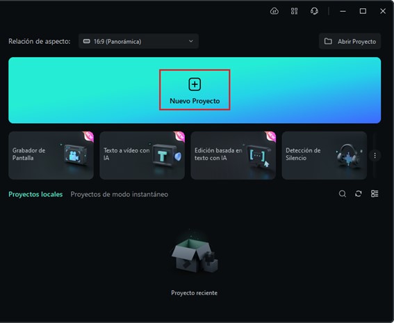 2. Abre Filmora y crea un nuevo proyecto: Al iniciar Filmora, selecciona la opción ‘Nuevo Proyecto’. Se abrirá la interfaz principal de edición de videos.