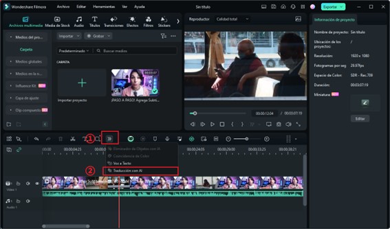 4. Utiliza la función de Traducción IA: En la barra de herramientas, selecciona ‘AI Tools’ y luego ‘Traducción con IA’. Elige el idioma original del video y el idioma de destino. Filmora transcribirá el audio del video y generará subtítulos en el idioma seleccionado.