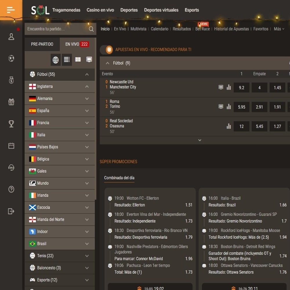 Otra de las casas de apuestas con mejores condiciones para apostar desde el punto de vista de margen de ganancias y herramientas adicionales. Las cuotas son muy competitivas y puedes encontrar probabilidades mejoradas para mercados seleccionados, especialmente en eventos populares de fútbol y básquetbol. Muchas opciones también cuentan con la opción de “retiro” anticipado. Es decir, cashout para cerrar tus apuestas antes del final del evento con tal de asegurar ganancias o minimizar pérdidas sin tener que esperar el resultado definitivo. La variedad está garantizada en Sol con más de 3.000 mercados de apuesta para explorar en partidos de fútbol, más de 900 en eventos de NBA y más de 200 en juegos de tenis. Apuesta con mejores cuotas en Sol