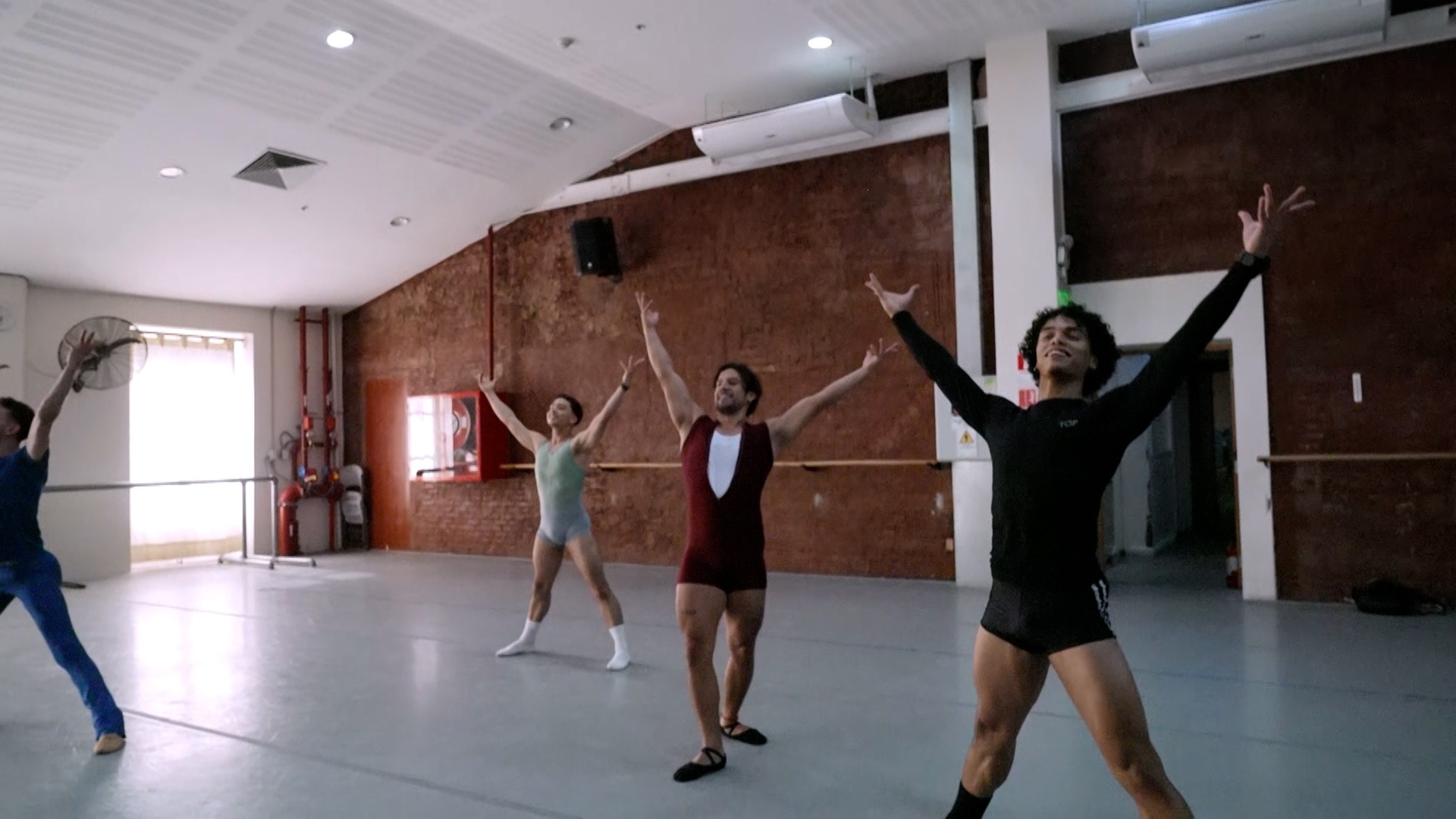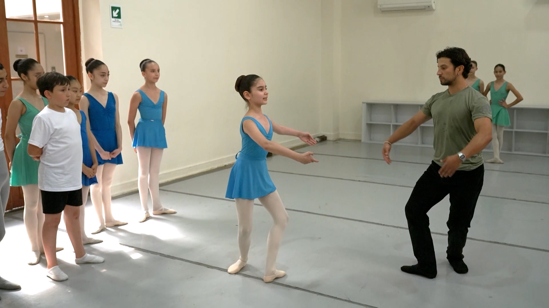 Junto a él, el actor se prepara en un ensayo de El Cascanueces, donde aprende pasos básicos de ballet bajo la instrucción de bailarines profesionales y su profesor.