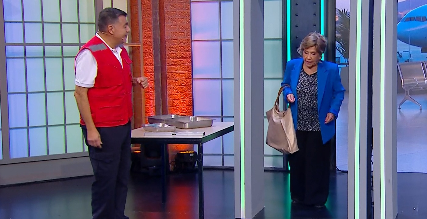 Sin embargo, el trabajador a cargo (Beto Espinoza) detecta que la mujer porta objetos metálicos en su cuerpo, por lo que le solicita dejarlos en un recipiente.