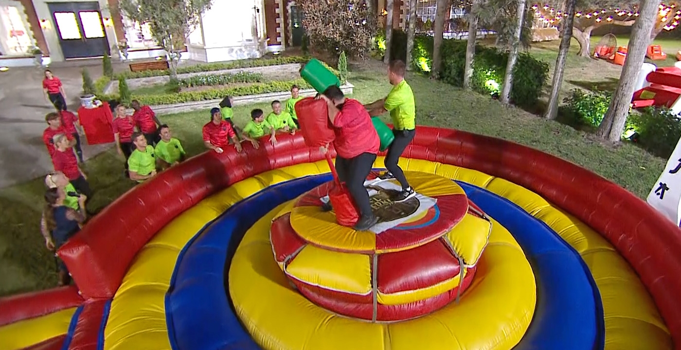 En una de ellas, los famosos tuvieron que subirse sobre una plataforma y arriba de ella, luchar contra un adversario para botarlo y ganar el punto.