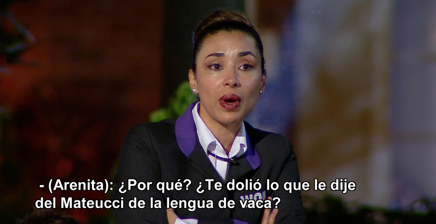 "Oye Arenita es súper cahuinera, es más rápida que el Whatsapp, escucha algo ahí, lo lleva para allá. Yo estoy sorprendida, pero más sorprendida con tu capacidad de comprar votos, reina ¿Hasta dónde vas a llegar? Te das vuelta la chaqueta de una manera...".