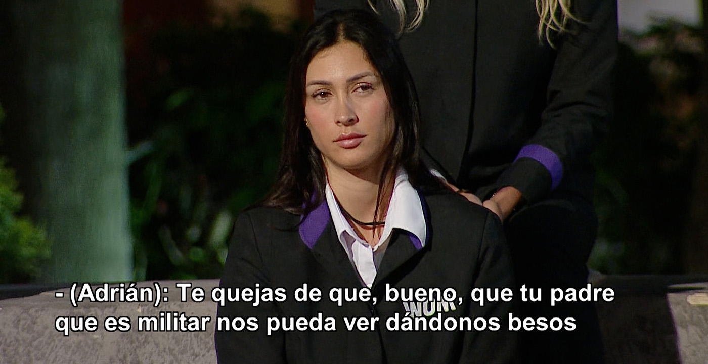 "Karina deja de hacer tonterías como el beso con Tom, que no me ha hecho ni pu... gracia. Te quejas de que tu padre que es militar nos pueda ver dándonos besos y pero te das un beso con otra persona que además tiene pareja acá adentro. Me parece feísimo".