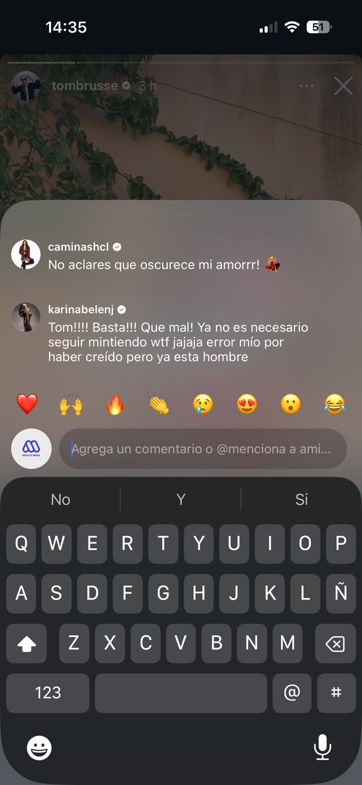 Kari Belén tampoco se quedó en silencio y también expresó su punto de vista:"Tom, basta, qué mal. Ya no es necesario seguir mintiendo, error mío por haber creído, pero ya está hombre".