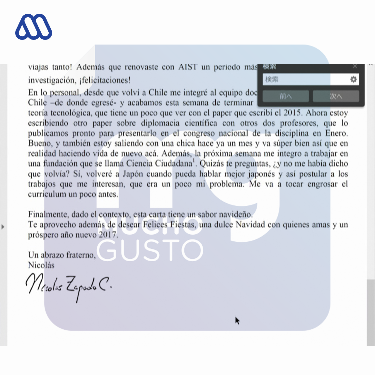 En entrevista con Rafael Cisneros, estudiante mexicano que compartió con Narumi Kurosaki y Nicolás Zepeda en Tsukuba, Japón, se dio a conocer una carta que el chileno le envió en diciembre de 2016, mismo mes en que desapareció la joven desde su residencia en la ciudad de Besanzón.