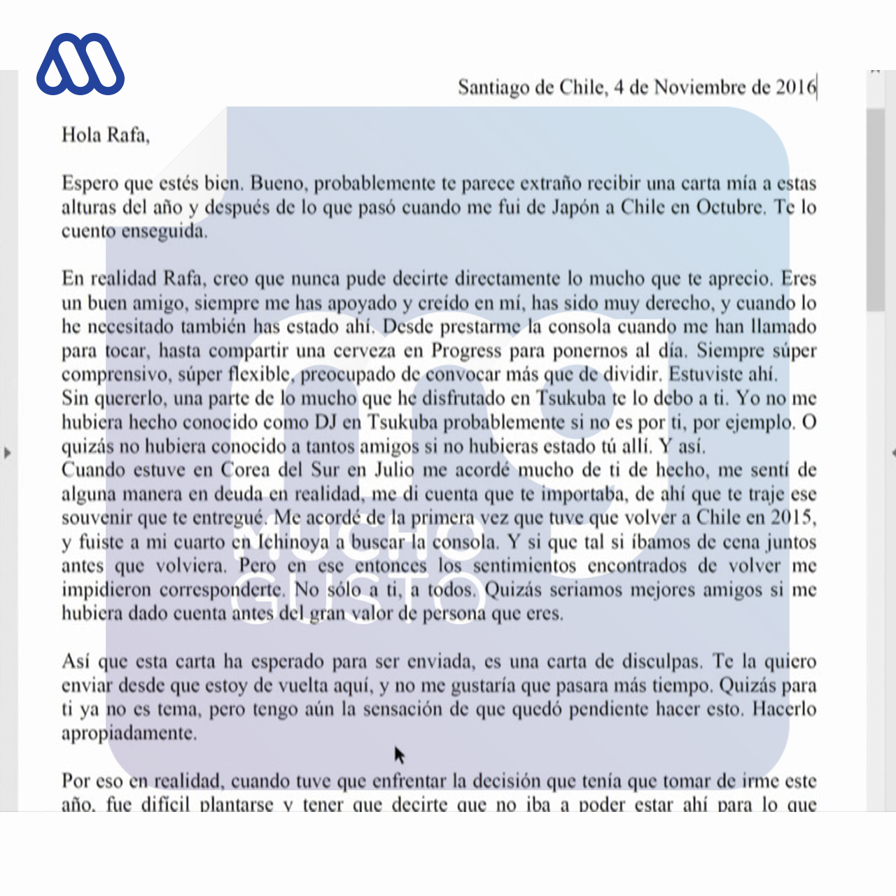 "Probablemente te parece extraño recibir una carta mía a estas alturas del año y después de lo que pasó en japón cuando me fui en octubre", inició la misiva el chileno.