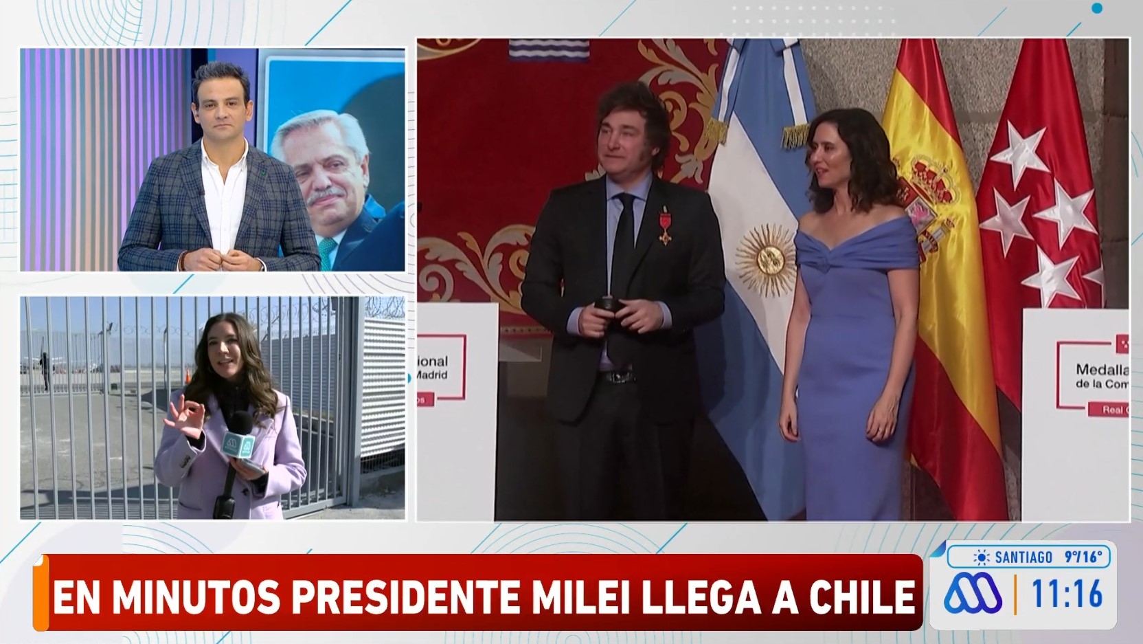 Según reportó Florencia Vial en Mucho Gusto, el mandatario argentino va a estar menos de 7 horas en el país. "De hecho, al no ser una visita de Estado, no se recibe en la loza de la FACh, sino que en una plataforma alternativa para aviones privados", detalló.