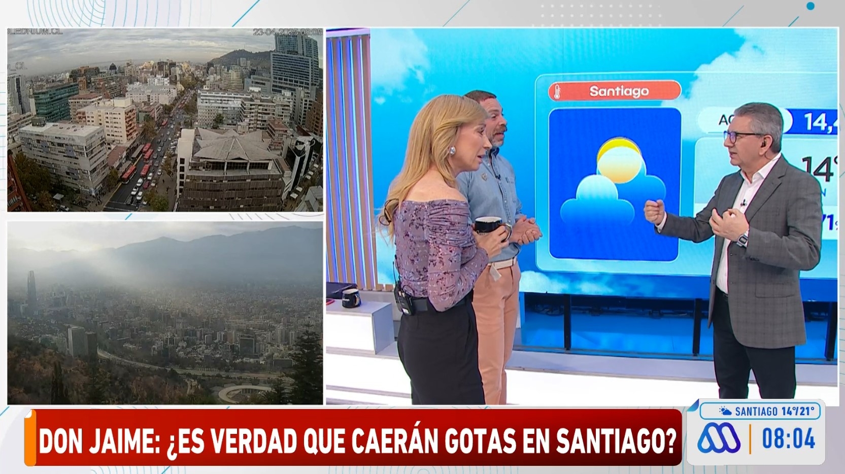 De acuerdo a lo indicado en Mucho Gusto, este miércoles "van a caer gotas muy aisladas y muy ocasionales en algunos sectores de Santiago", precisando que en lo absoluto es necesario desempolvar el paraguas.