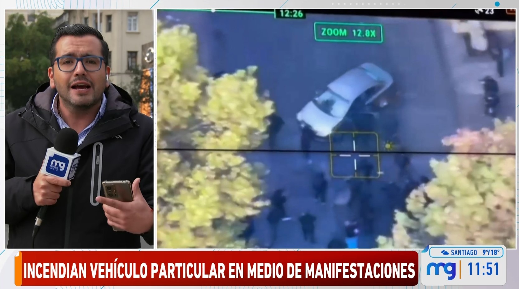 En plena intersección de Alameda con República, desconocidos, vestidos de negro y con capuchas, incendiaron un vehículo particular, el cual se habría encontrado estacionado en las inmediaciones.
