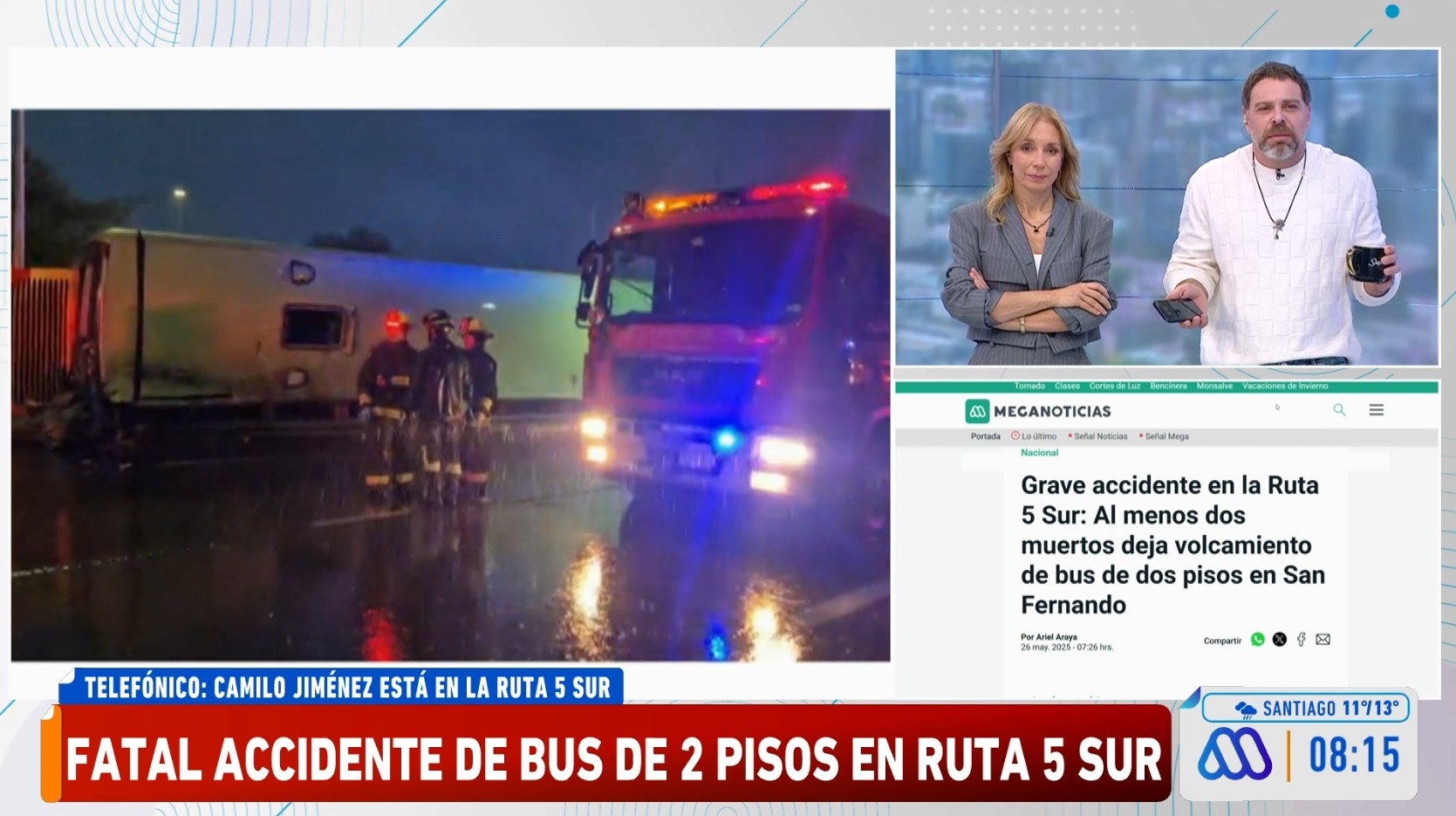 De acuerdo a lo relatado por el periodista Danilo Villegas en Mucho Gusto, la máquina de dos pisos traspasó la barrera central de la carretera, quedando volcado en la calzada contraria que va hacia el sur.