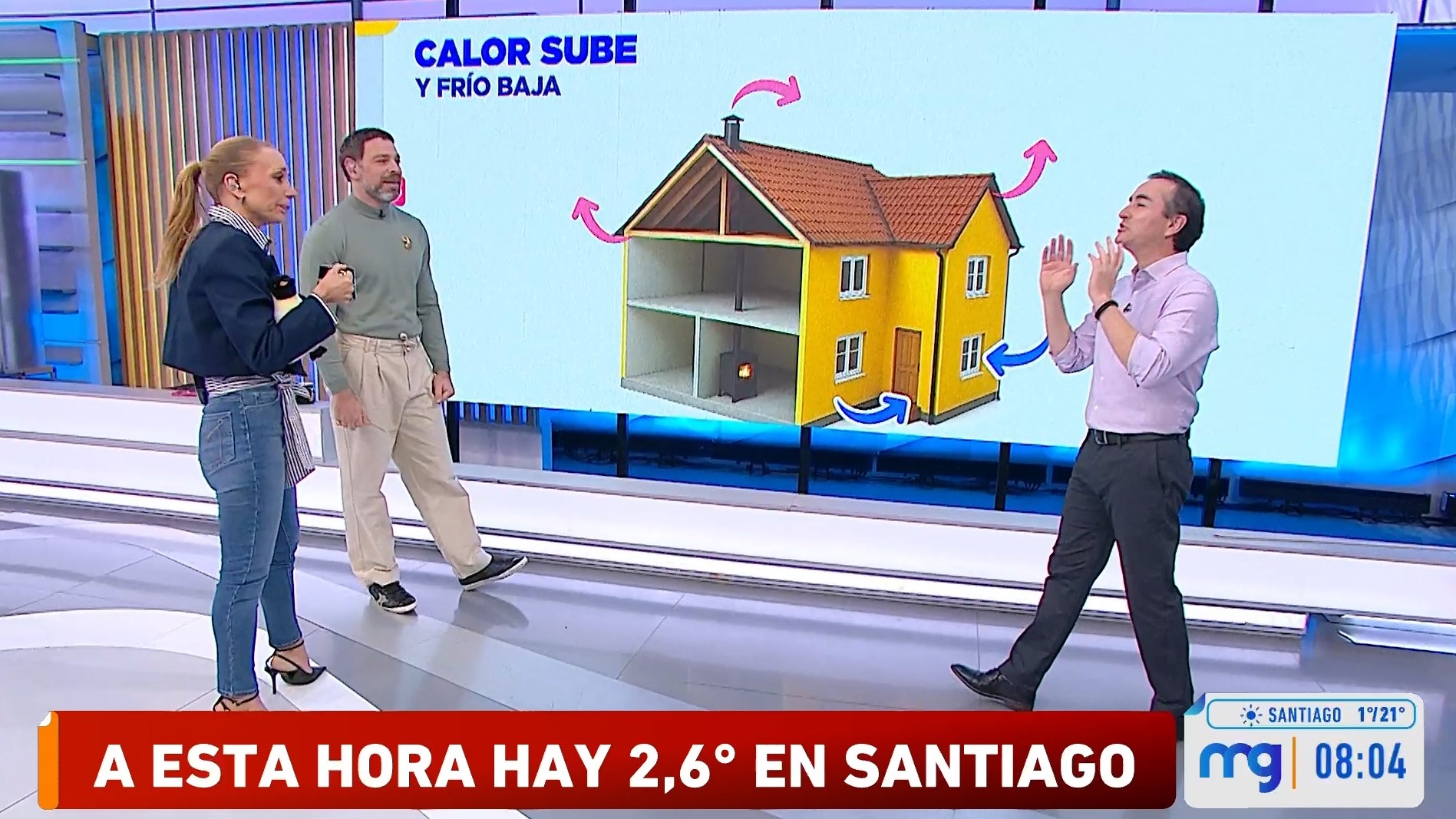 Para ejemplificar esto, se apoyó de una gráfica interactiva de una casa de dos pisos, afirmando que "aire frío entra por las rendijas, por ejemplo, debajo de la puerta o por las ventanas. Mientras que el calor que genero dentro de la casa tiende a escaparse por arriba porque es más liviano. Por eso es más calentito el segundo piso".