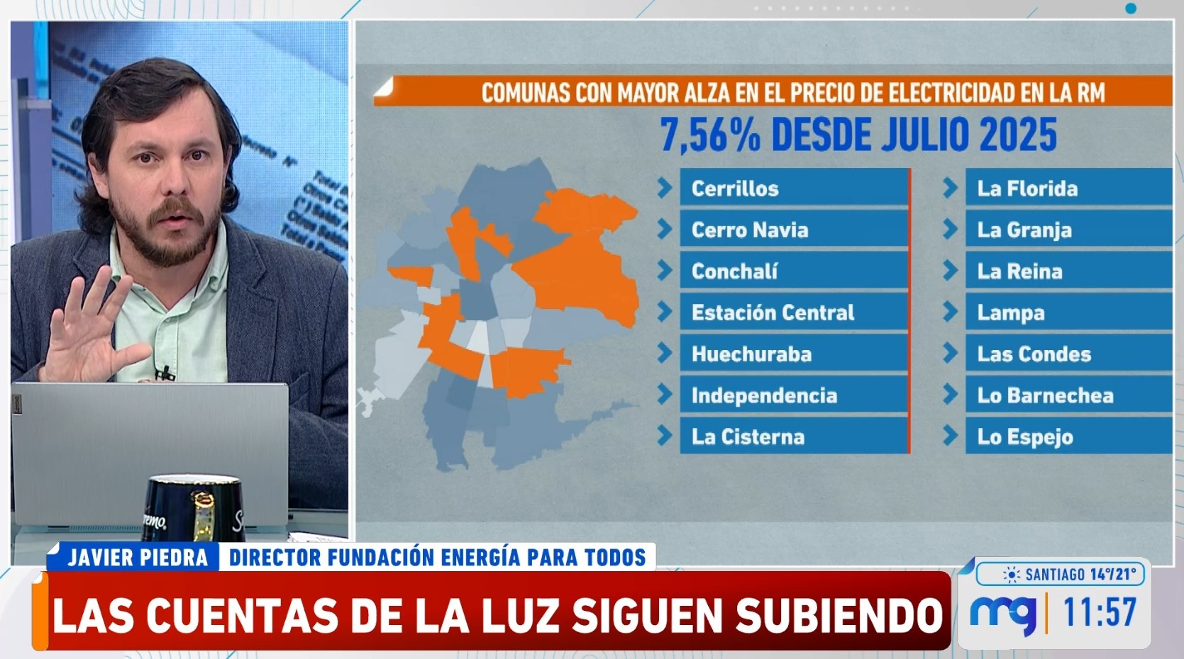 Pero, ¿por qué en una región unas comunas pueden sufrir un alza mayor que en otras? Piedra detalló que "cuando uno paga la cuenta, paga tres grandes componentes: la energía, que es el 70%, o sea, una cuenta de $30.000, $21.000 se van a las generadoras".