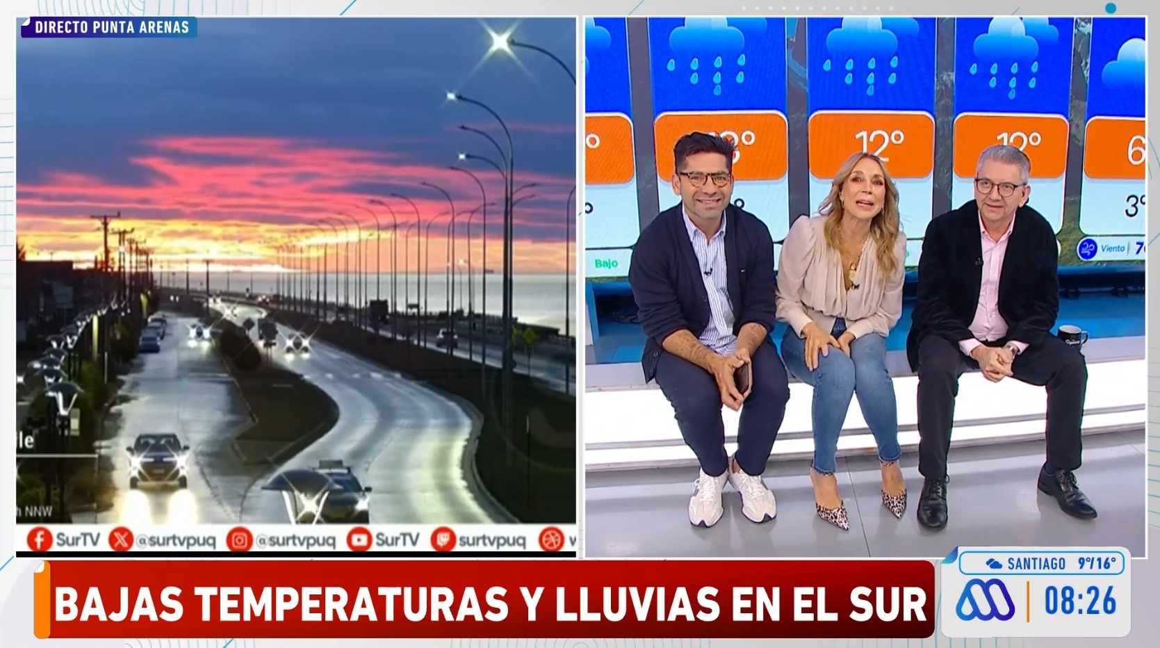 En medio de su labor revelando cómo se vienen los próximos días en las distintas ciudades del país, el meteorólogo junto a Karen Doggenweiler y Karim Butte se tomaron un tiempo para sentarse y observar el bello amanecer que se registró en Punta Arenas.