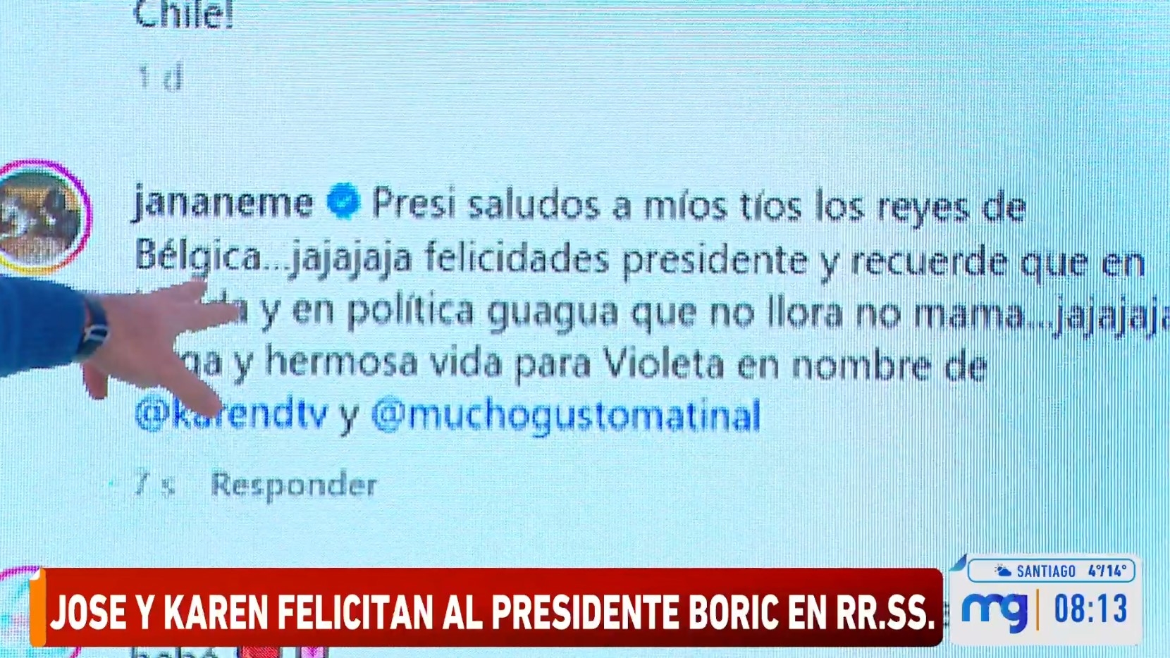 "Presi, saludos a mis tíos, los reyes de Bélgica… jajajaja. Felicidades, Presidente, y recuerde que en la vida y en la política guagua que no llora, no mama… jajajaja. Larga y hermosa vida para Violeta en nombre Karen Doggenweiler y Mucho Gusto", escribió el periodista.
