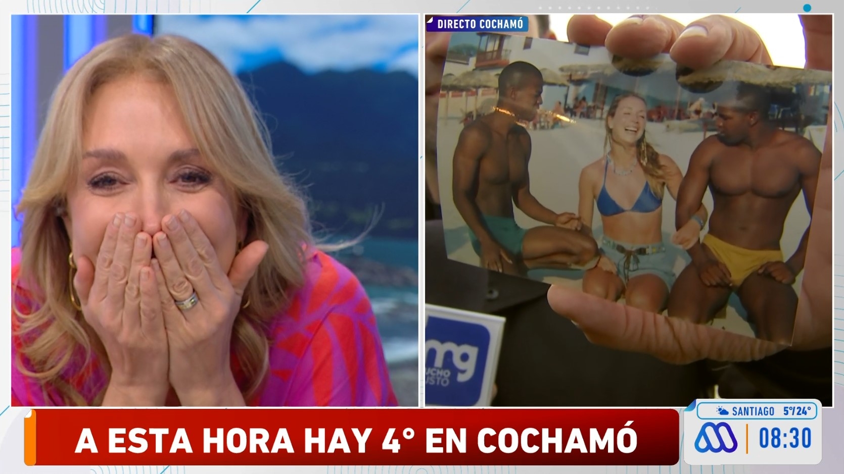 "Karen, quiero una explicación para esto", dijo el periodista segundos antes de que mostrara en pantalla una fotografía donde aparece Karen sentada en la playa junto a dos tonificados hombres. Esto tomó por sorpresa a la conductora que soltó a reír y taparse la cara. "¡Qué verguenza…! Oye, pero yo hice desaparecer todos esos materiales de TVN", expresó.