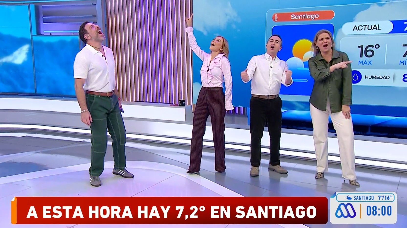 Una vez inició el matinal, las cámaras enfocaron de inmediato a los animadores acompañados de los periodistas Alejandro Sepúlveda y Marianne Schmidt, quienes gozaban cantando una de las icónicas canciones de Paulina Rubio: "Yo no soy esa mujer".