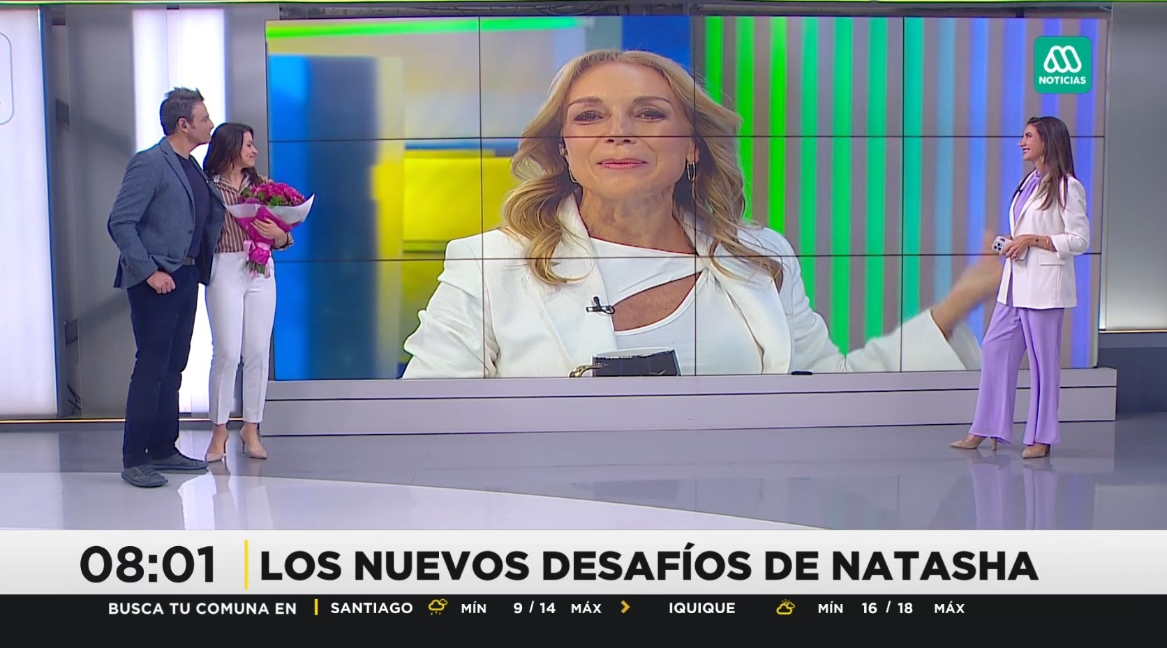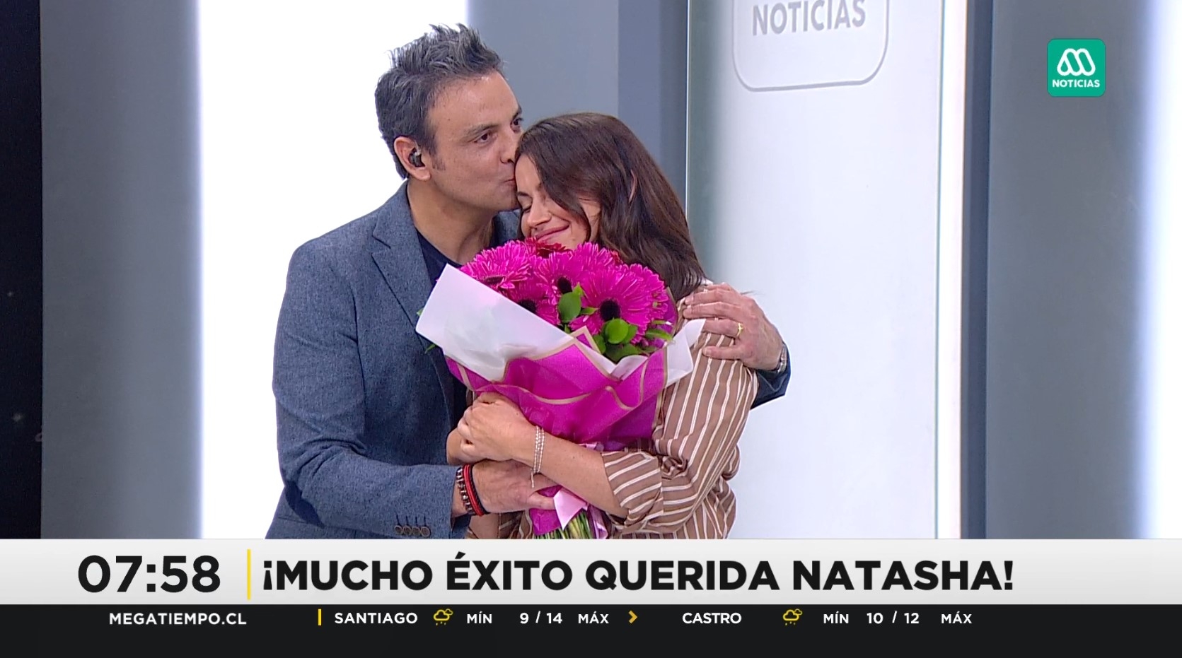 "Les queremos contar que Mega ahora va a estar muchísimo más cerca de nuestro querido viejo continente, porque nuestra querida conductora Natasha Kennard va a emprender un nuevo desafío y se va a convertir en la nueva corresponsal oficial de Meganoticias en Londres. Obviamente, le queremos entregar un cariñoso saludo, que te vaya increíble", expresó Vial, mientras Natasha era abrazada por su compañero de mil batallas, Gonzalo Ramírez.